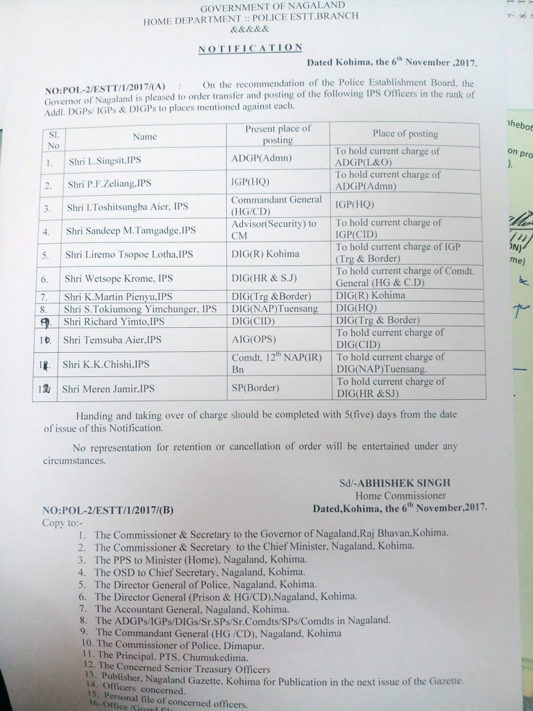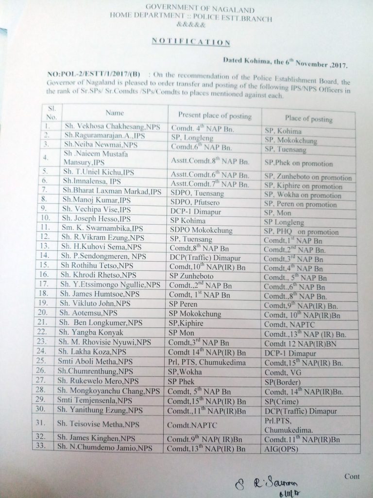 On the recommendation of the Police Establishment Board, the Governor of Nagaland is pleased to order transfer and posting of the following IPS/NPS Officers in the rank of Sr.SPs/Sr.Comdts/SPs/Comdts to places mentioned against each.