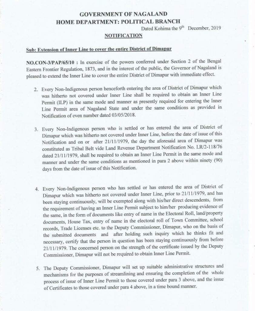 Nagaland Govt notifies for extension of ILP to cover Dimapur district