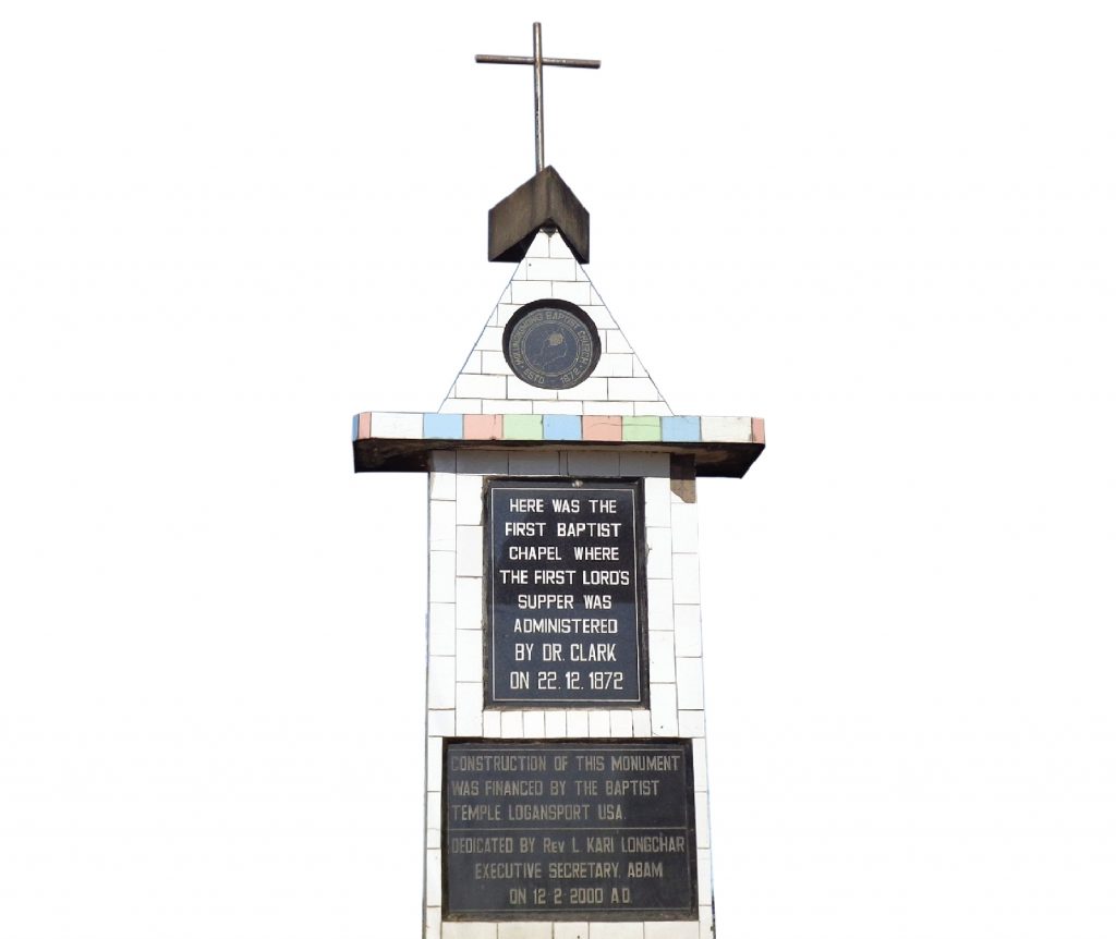 First Chapel Hall Monument: At this very spot, the Chapel hall was constructed where the First Lord’s Supper was administered by Rev. Dr. E.W. Clark on 22nd December 1872. The first bamboo Chapel at Molungkimong which was built without any assistance from the mission, served to evangelize the natives and also for teaching basics of modern education. Dr. Clark and Godhula introduced the 3Rs method of teaching (Reading, Writing and Arithmetic) and taught alphabets and numerals alongside Biblical stories and hymns. The natives were also taught to read hours, days, months and years in numerals and were instructed on health measures, cleanliness and hygiene in the Chapel, Morung and households