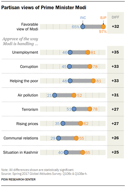 Public assessment of his dealings with various challenges is quite partisan. On all eight of the issues surveyed, BJP adherents are more likely than Congress backers to approve of Modi’s performance, by 25 points or more.