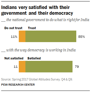 The Indian public, happy with its prime minister, believes the national government is doing the right thing for the country. More than eight-in-ten (85%) voice trust in the national government, including 39% who express a lot of trust. BJP supporters (90%) are more trusting of the government than Congress backers (76%).