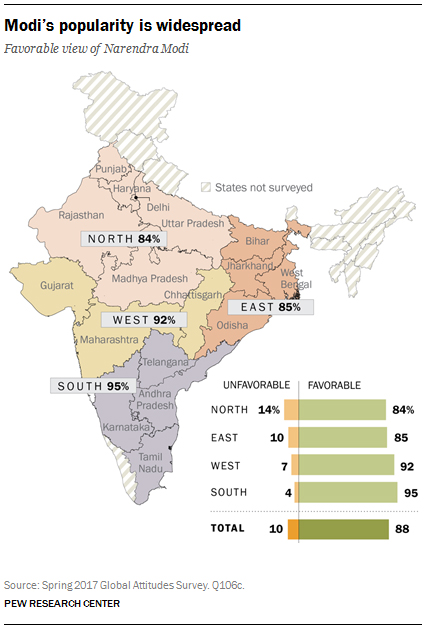 Modi’s overwhelming popularity extends across India. At least nine-in-ten Indians in the southern states of Andhra Pradesh, Karnataka, Tamil Nadu and Telangana and in the western states of Maharashtra, Gujarat and Chhattisgarh hold a favorable view of the prime minister. The same is true for more than eight-in-ten in the eastern states of Bihar, Jharkhand, Odisha and West Bengal and the northern states of Delhi, Haryana, Madhya Pradesh, Punjab, Rajasthan and Uttar Pradesh.
