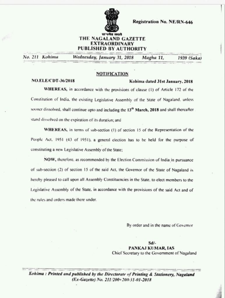 The following is the issue of notification as appearing in the Nagaland Gazette dated January 31, 2018 for the General Election to the 13th Nagaland Legislative Assembly