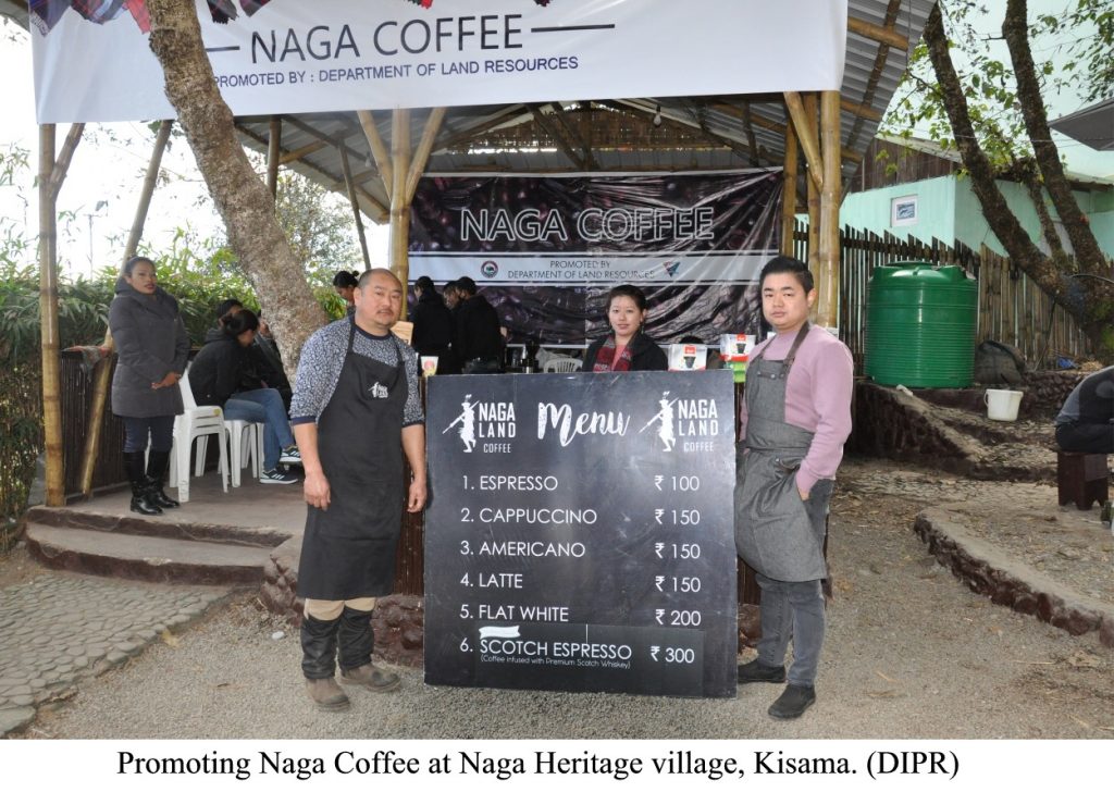 Nagaland Coffee at Kisama is a coffee stall run by Kajukho Arucho, Vivito Yeptho and Dr. Peter Vermeulen from the South Africa which is being promoted by the Department of Land Resources.