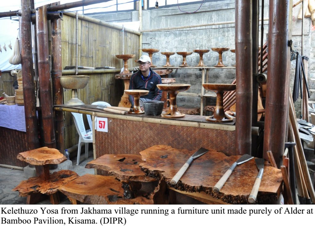 A young and energetic youth from Jakhama village named Kelethuto Yosa who did his BA History (Honours) from Delhi University run a stall “Yosa Furniture Unit”, made purely of Alder tree, also known as the state tree of Nagaland at Bamboo Pavilion, Naga Heritage Village, Kisama.