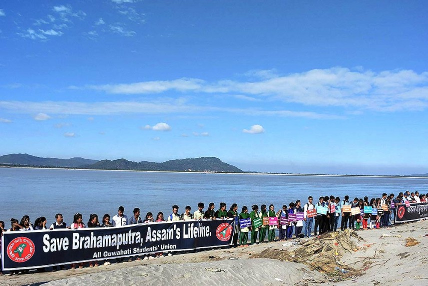 Activists of the All Assam Students Union (AASU) forming a human chain while staging a protest on the bank of river Brahmaputra, in Guwahati. The protesters were demanding from the Central and State Governments to take steps to make the river pollution free.