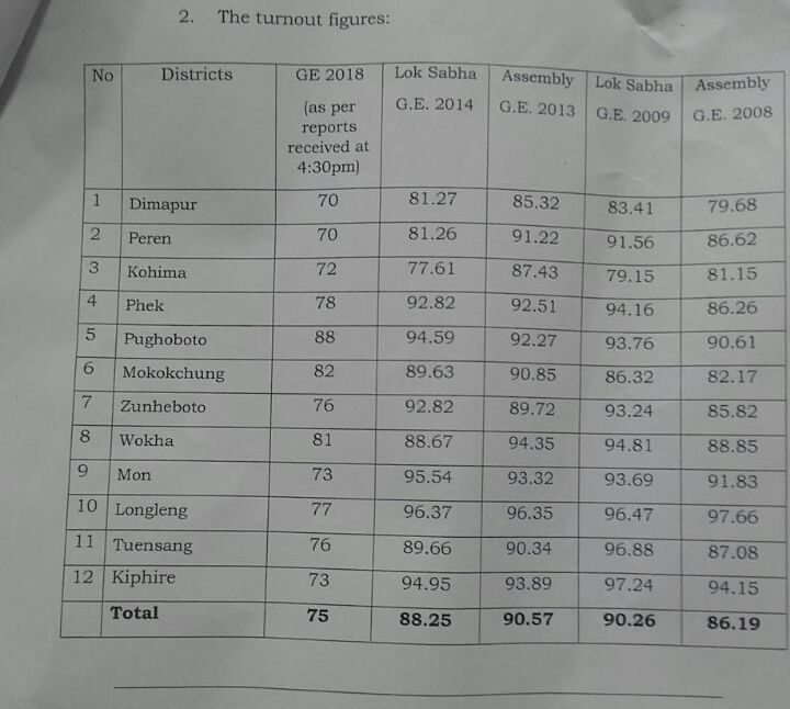 Seventy-five per cent polling was recorded in the Nagaland Assembly elections on Tuesday, the Election Commission said. However this figure is likely to go up as more update was awaited from poll officials who were yet to report back from their respective outposts. A few repoll is also expected to be announced tomorrow by the Election Commission after scrutiny of today’s election report.