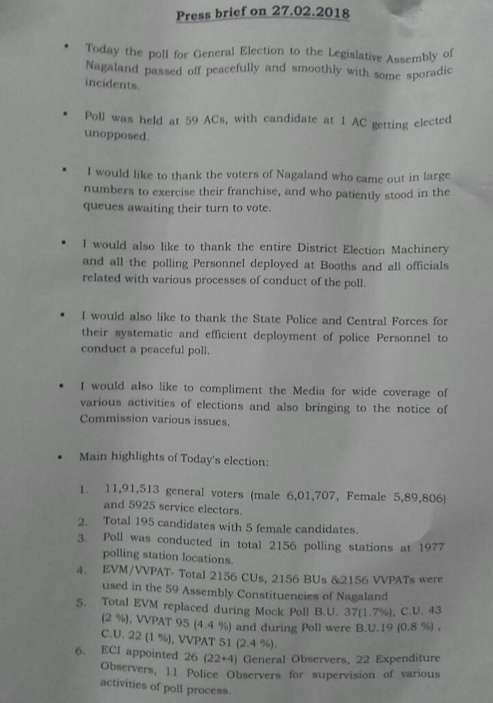 Meanwhile, addressing the media personnel at the Conference Hall of AMK Building, Kohima on 27th February, 2018, CEO, Abhijit Sinha, IAS said heavy shower the day before had worsened the road conditions so on the day of poll some polling parties reached the venue quiet late, some even after 12 PM.