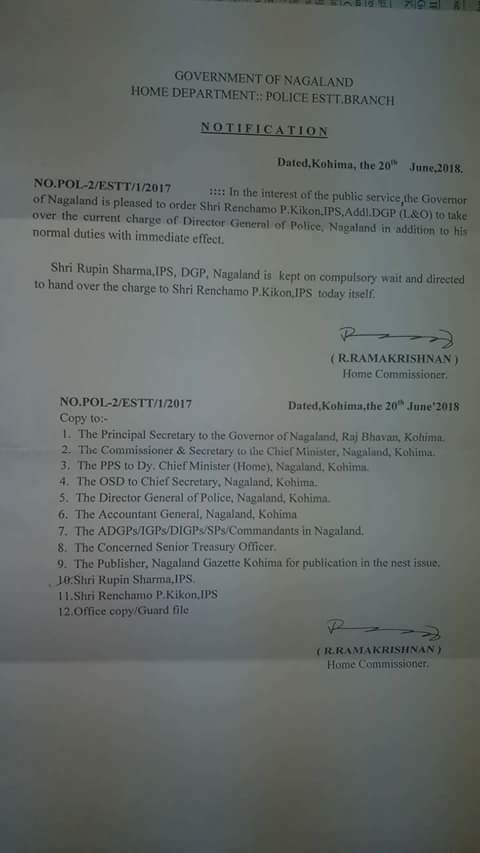 Nagaland Director General of Police Rupin Sharma was formally removed from his post on Wednesday despite a campaign demanding that he be retained. Renchamo P Kikon, the additional director general of police, took over from Sharma with immediate effect, an official notification read (see below).