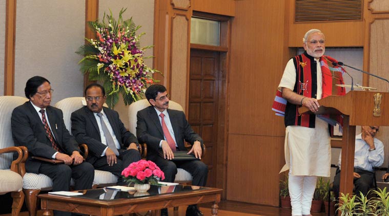 In this file photo Prime Minister Narendra Modi is seen speaking during the signing of the Framework Agreement on August 3 , 2015. Also seen in the picture are NSCN (IM) General Secretary Th Muivah, National Security Advisor Ajit Doval and Delhi’s Interlocutor for the Naga talks RN Ravi