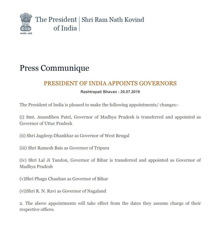 “The above appointments will take effect from the dates they assume charge of their respective offices,” said a communique from the Rashtrapati Bhavan.