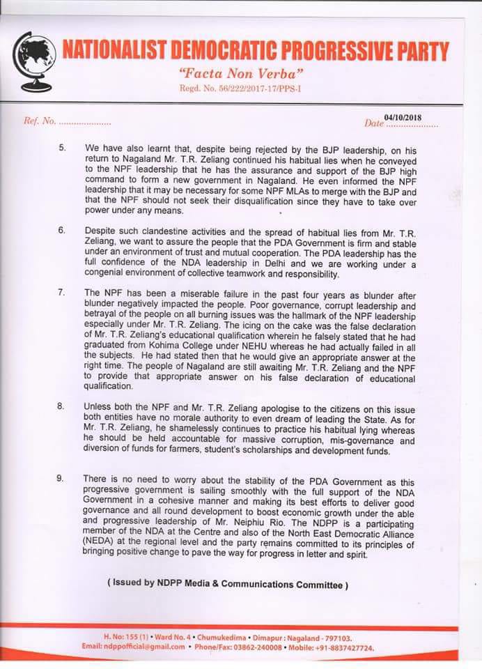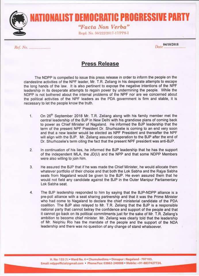 The NDPP issued a statement on Thursday (Oct 4) stating it was compelled to inform the people about the “clandestine activities” of Zeliang. “On 26th September, 2018, Mr. TR Zeliang along with his family member met the central leadership of the BJP in New Delhi with his grandiose plans of coming back to power as chief minister of Nagaland. He informed the BJP leadership that the term of the present NPF president Dr. Shurhozelie is coming to an end very soon and that a new leader would be elected as NPF president and thereafter the NPF will align with the BJP.