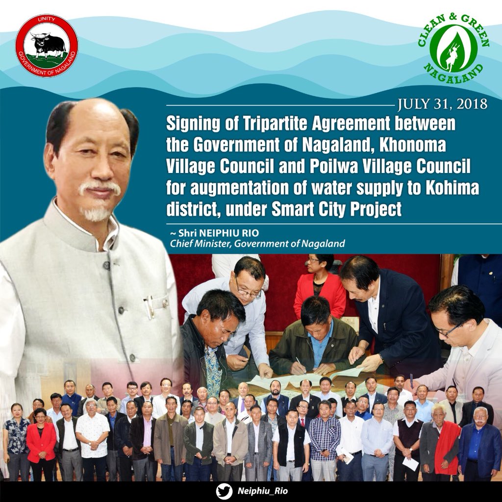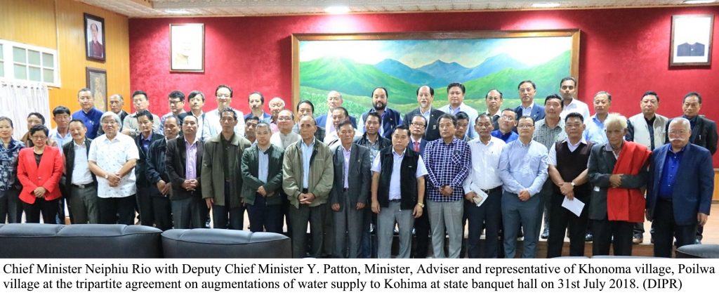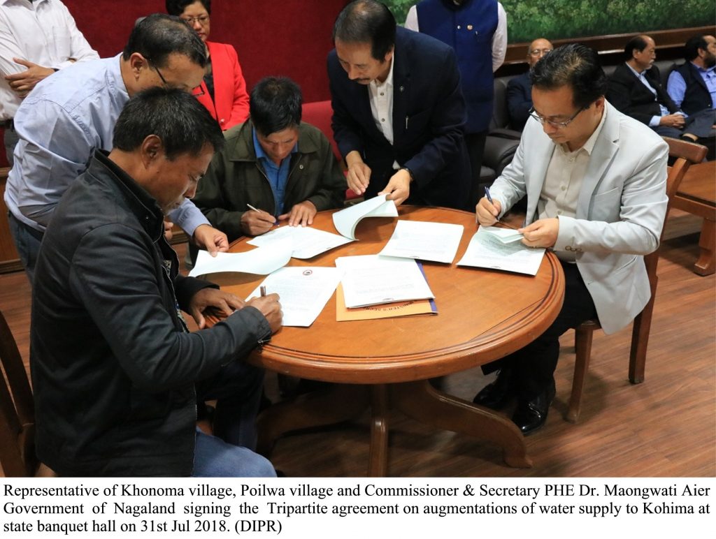 A programme for signing of the Tripartite Agreement on Augmentations of Water Supply to Kohima, between two Naga villages, Poilwa and Khonoma with the Government of Nagaland was held at State Banquet Hall on 31st July 2018. Poilwa is a Zeliang village coming under Peren district while Khonoma is an Angami village under Kohima district.