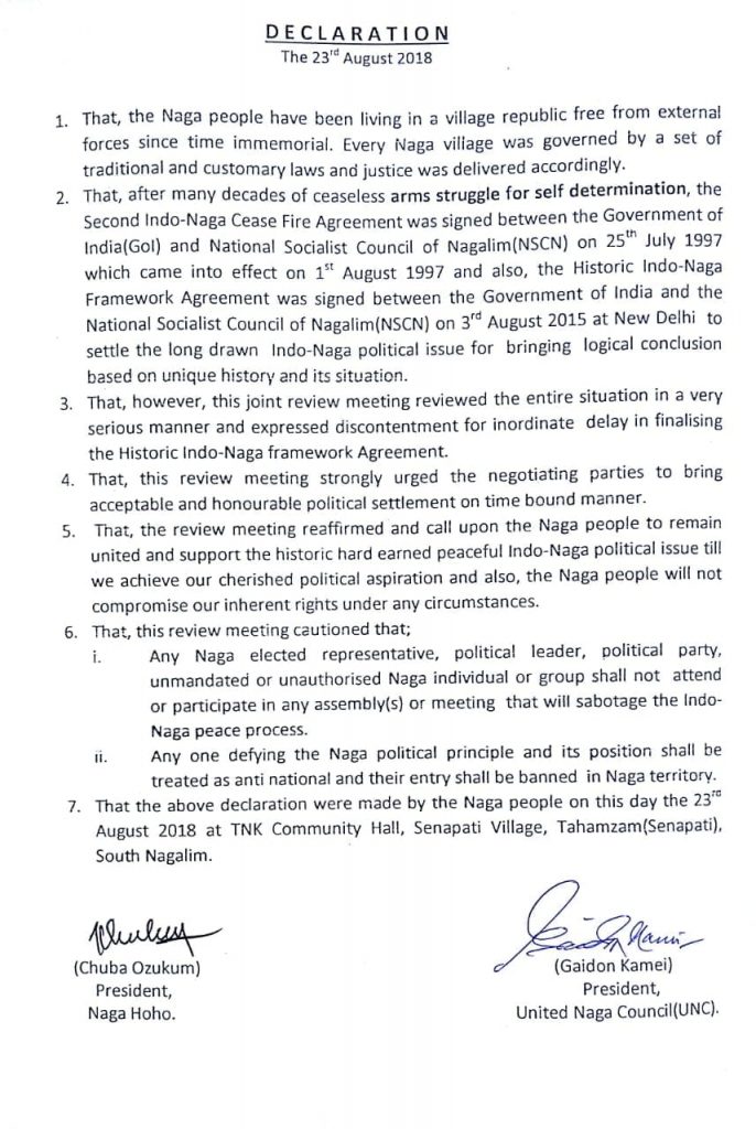 According to the declaration, any one defying the “Naga political principle and its position shall be treated as anti national and their entry shall be banned in Naga territory”. The public declaration was signed by Chuba Ozukum, President, Naga Hoho and Gaidon Kamei, President, UNC. Significantly the place of the meeting was recorded as Tahamzam (Senapati), South Nagalim.