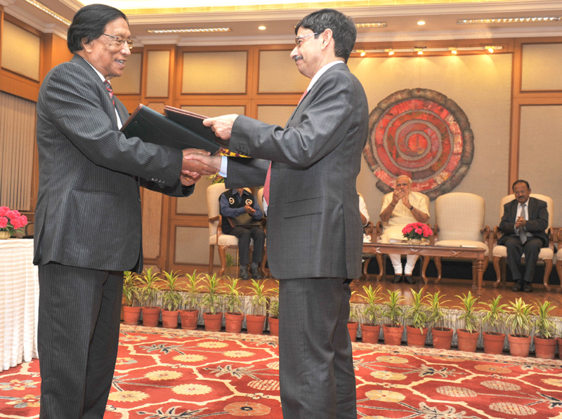 NSCN (IM) General Secretary Th. Muivah and Government of India Interlocutor RN Ravi shaking hands after the signing of the Framework Agreement on August 3, 2015 in the presence of Prime Minister Narendra Modi