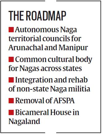 The accord, official sources told The Indian Express, does not change the boundary of states; provides autonomous Naga territorial councils for Arunachal and Manipur; a common cultural body for Nagas across states; specific institutions for state’s development, integration and rehabilitation of non-state Naga militia and the removal of the Armed Forces Special Powers Act.