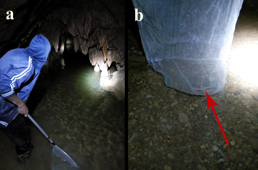 a) Inside Krem Kung. b) A specimen of Schistura larketensis caught using a scoop net. Photos by D. Khlur B. Mukhim.